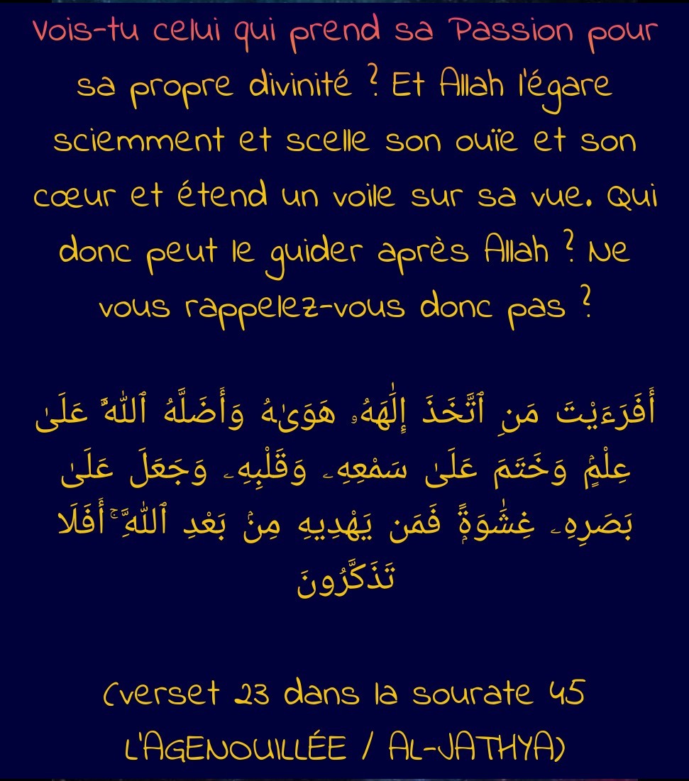 Vois-tu celui qui prend sa Passion pour sa propre divinité ? Et Allah l'égare sciemment et scelle son ouïe et son cœur et étend un voile sur sa vue. Qui donc peut le guider après Allah ? Ne vous rappelez-vous donc pas ?