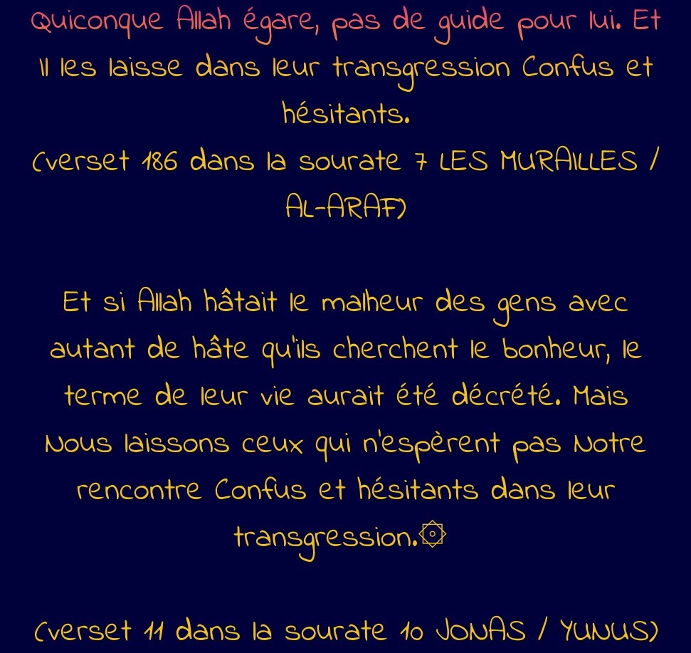 Alors quand Allah nous exhorte a nous méfier de ne pas être comme l'assoiffé qui se retrouve face à un mirage a la place d' un oasis , cela veut dire que tu n'as pas profité de la révélation pour te donner la VRAIE VIE , celle qui donne vie aux coeurs , tu n'as pas suivi non plus le Coran et la sunna, surtout tu n'as pas bu les paroles de ton seigneur en lisant son livre ...